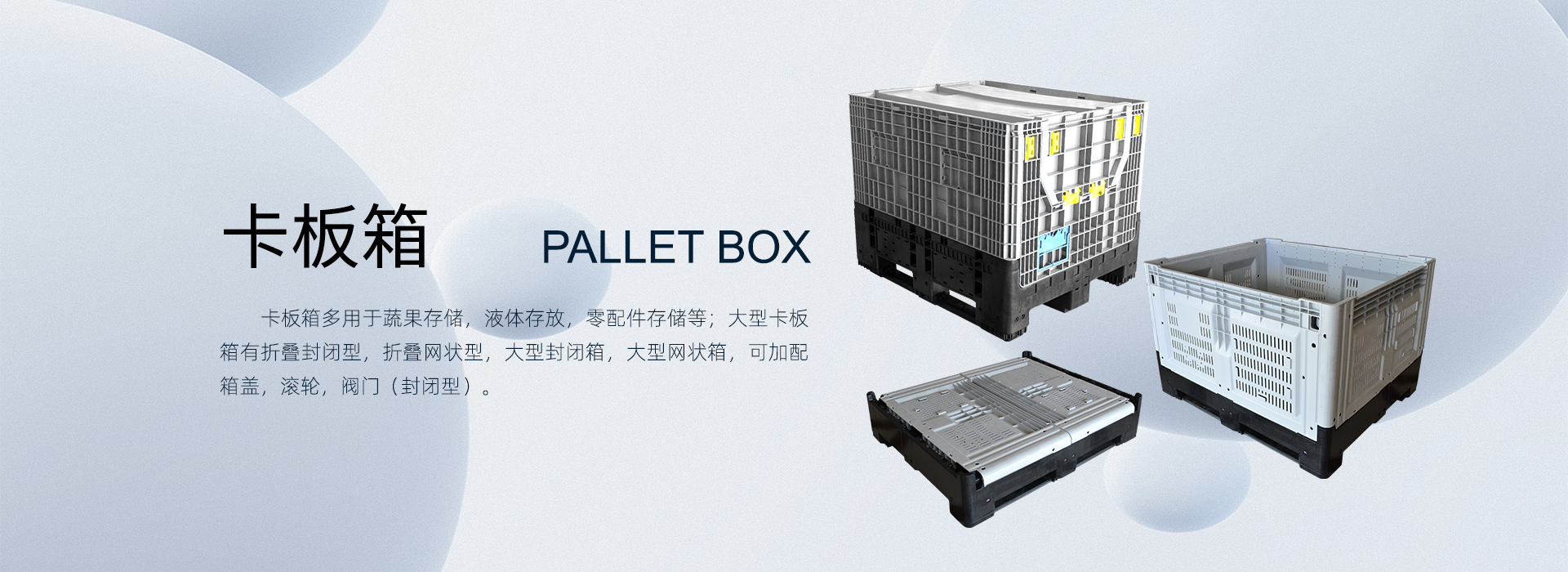 • 卡板箱多用于蔬果存儲(chǔ),液體存放,零配件存儲(chǔ)等;大型卡板箱有折疊封閉型、折疊網(wǎng)狀型、大型封閉箱、大型網(wǎng)狀箱;可加配箱蓋,滾輪、閥門(mén)(封閉型)。
